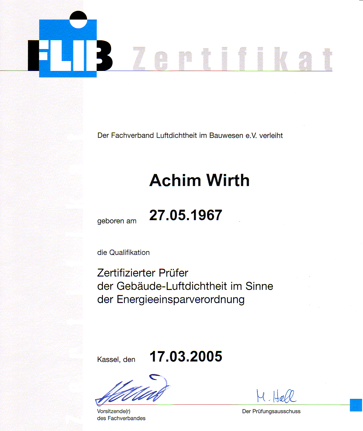 Die Messung wird durch vom FLiB (Fachverband für Luftdichtheit im Bauwesen) zertifizierte Prüfer durchgeführt.